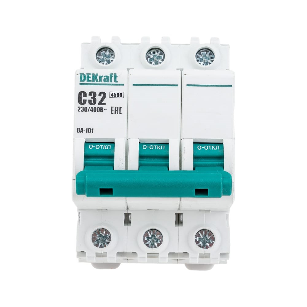 Автоматический выключатель серии ВА-101 Dekraft3Pноминальный ток 32 Ахарактеристика Сотключающая способность 4,5 кА5 монолитных заклепок повышают прочность корпуса аппарата. Сплошная лицевая панель обеспечивает безопасность эксплуатации аппарата. Боковые каналы охлаждения повышают стабильность работы при высоких температурах окружающей среды. Есть возможность установки дополнительных аксессуаров с левой стороны устройства. Аппарат на 100% совместим с корпусами Dekraft и Systeme Electric.