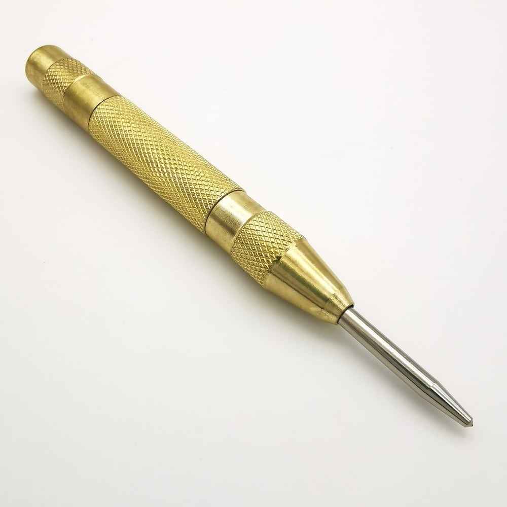Кернер автоматический - удобный инструмент для разметки или подготовки места под сверление. Не требуется использования молотка. Встроенная пружина с регулированием силы удара. Стержень кернера - из твердой легированной стали. Корпус кернера - из латуни с накатанной поверхностью, для предотвращения проскальзывания в руке.