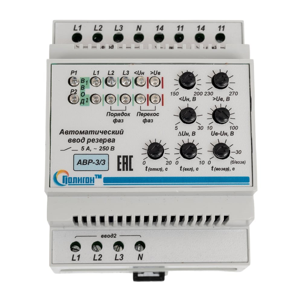 Автоматический ввод резерва ПОЛИГОН АВР-3/3 ПЛГН.991002.043 с микропроцессорным управлением предназначено для контроля напряжения по двум независимым трехфазным вводам с общей нейтралью и переключения трехфазной нагрузки при возникновении аварии с основного ввода на резервный ввод при помощи внешнего исполнительного устройства. Выполнен в корпусе для установки на DIN-рейку. На передней панели блока находятся ручки регуляторов установки режима работы реле и индикаторы состояния сети.