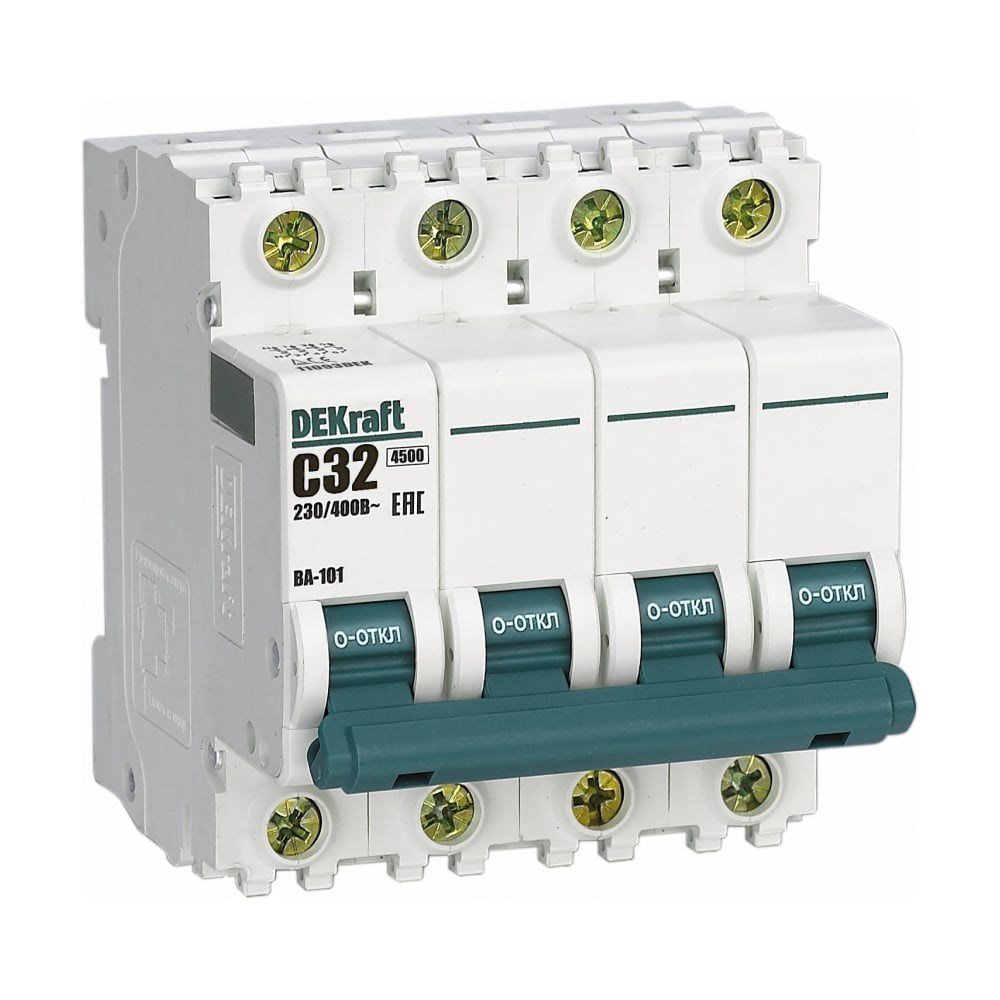 Автоматический выключатель серии ВА-101 Dekraft4Pноминальный ток 32 Ахарактеристика Сотключающая способность 4,5 кА5 монолитных заклепок повышают прочность корпуса аппарата. Сплошная лицевая панель обеспечивает безопасность эксплуатации аппарата. Боковые каналы охлаждения повышают стабильность работы при высоких температурах окружающей среды. Есть возможность установки дополнительных аксессуаров с левой стороны устройства. Аппарат на 100% совместим с корпусами Dekraft и Systeme Electric.
