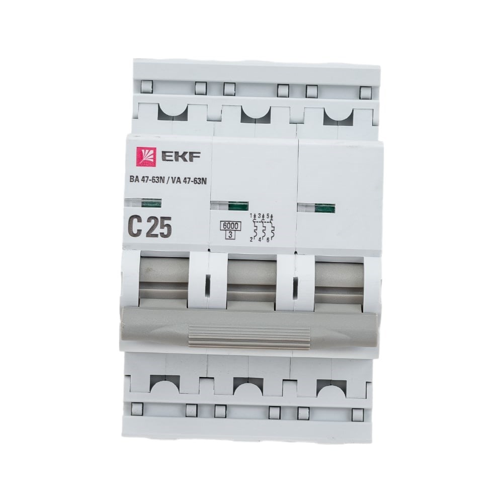 Автоматический выключатель EKF 3P 25А (C) 6кА ВА 47-63N PROxima M636325C - это компактный прибор, позволяющий осуществлять ручное отключение и включение управляемых им участков цепи и обеспечивающий защиту элетросети от короткого замыкания и перегрузки. Устанавливается в настенном щите или напольном шкафу на DIN-рейку. Конструкция модели автоматического выключателя дает возможность подключать дополнительные контролирующие, управляющие и обслуживающие устройства.