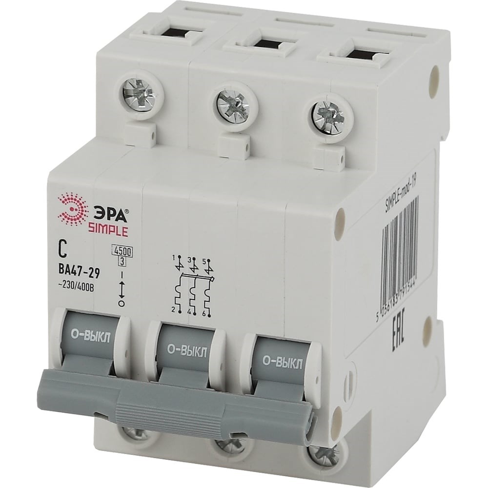 Автоматический выключатель ЭРА SIMPLE SIMPLE-mod-20 ВА 47-29 3P 10А кривая C 4,5кА Б0039237 предназначен для применения в электрических цепях напряжением до 400 В переменного тока частоты 50 Гц, их защиты при перегрузках и коротких замыканиях, проведения тока в нормальном режиме и не частых оперативных включений и отключений указанных цепей.