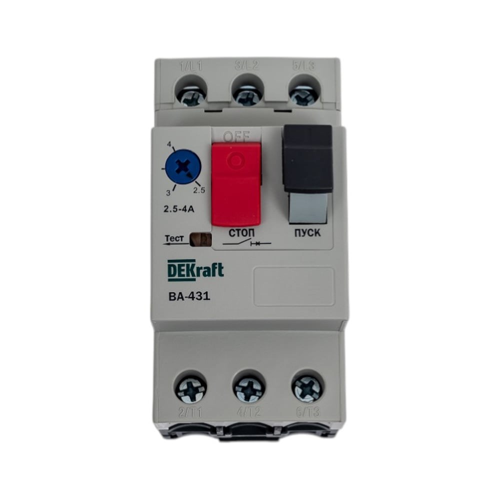 Автоматический выключатель серии ВА-431 Dekraftдиапазон уставок тока 2,5 - 4,0 Аном. раб. напряжение 690 Всечение подключаемых проводников 1,0 - 6,0 кв. ммКорпус устройства изготовлен из самозатухающей пластмассы. Автоматические выключатели защиты двигателя серии ВА-431 Dekraft предназначены для управления и защиты трехфазных асинхронных электродвигателей от короткого замыкания, перегрузки и выпадения фазы. Дополнительно доступен ряд аксессуаров, облегчающих работу с устройством.
