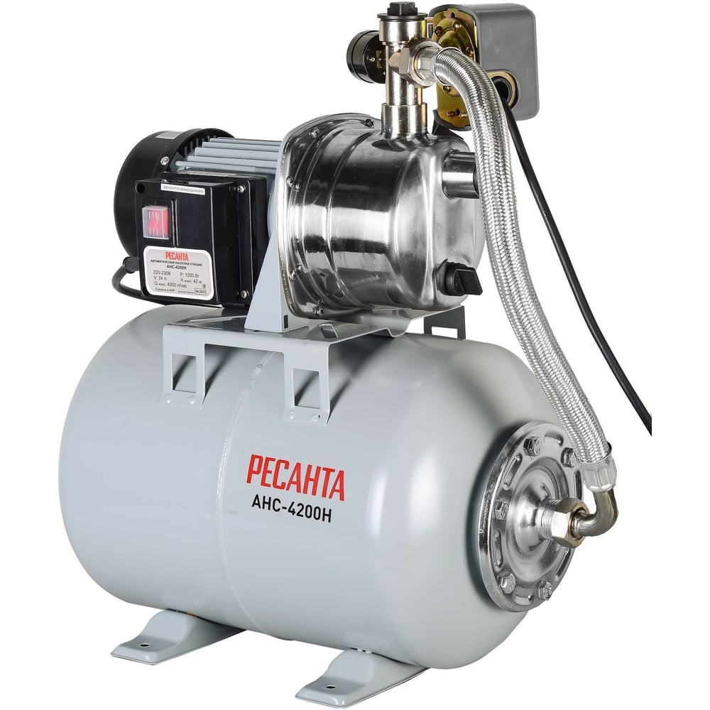 Насосная станция Ресанта АНС-4200Н применяется для организации подачи чистой воды к водопотребителям в жилых и производственных помещениях. Концентрация механических включений в воде не должна превышать 150 г/м³.Автономная насосная станция включает весь необходимый для водоподведения набор узлов в сборе. В состав Ресанта АНС-4200Н входят насос, гидроаккумулятор на 24 л, а также реле с защитой от перегрева и «сухого» хода. Накопительный бак снабжен ножками для крепления к поверхности. Фиксация снижает вибрацию и шум во время работы. Двигатель мощностью 1200 Вт заключен в корпус из нержавеющей стали. Для продления ресурса рабочих узлов количество включений АНС ограничено 20 стартами в час.Автономная насосная станция поддерживает давление воды в водопроводе от 1,5 до 3 бар. АНС присоединяется к водопроводу при помощи труб с диаметром 1 дюйм. Благодаря эжектору насос поднимает воду из колодца или скважины глубиной до 9 м с повышенным содержанием взвеси, газов и других включений. Насосная станция способна перекачивать до 70 л/мин. Максимальная высота подъема доходит до 42 м.Модель Ресанта АНС-4200Н может обеспечивать снабжение водой до четырех открытых водозаборных точек, при заборе с глубины до 5м и при длине магистрали до 5м. При заборе с глубины до 6м и при длине магистрали до 5м станция обеспечит водоснабжение до трех открытых водозаборных точек. При заборе с глубины до 7м и при длине магистрали до 5м станция обеспечит водоснабжение до двух одновременно открытых точек.