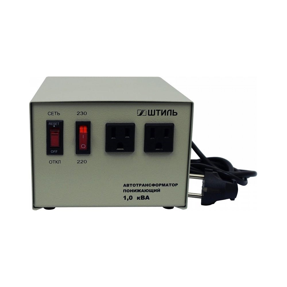 Автотрансформатор Штиль 1,0 кВА в сером корпусе АТ 230-220/СТО-1,0-50 с/к предназначен для электропитания приборов, аппаратуры и устройств переменным током напряжением 100 В от стандартной электросети с напряжением 220 В или 230 В. Автотрансформатор может использоваться для электропитания японской аппаратуры, рассчитанной на электропитающую сеть 50/60 Гц 100 В. Изделие представляет собой понижающий однофазный преобразователь напряжения, состоящий из следующих основных частей: металлический корпус, понижающий автотрансформатор на тороидальном сердечнике, автоматический выключатель "СЕТЬ", переключатель "220-230 В", позволяющий выбрать напряжение сети, две розетки американского стандарта для подключения нагрузки на 100 Вольт, сетевой шнур с евровилкой.