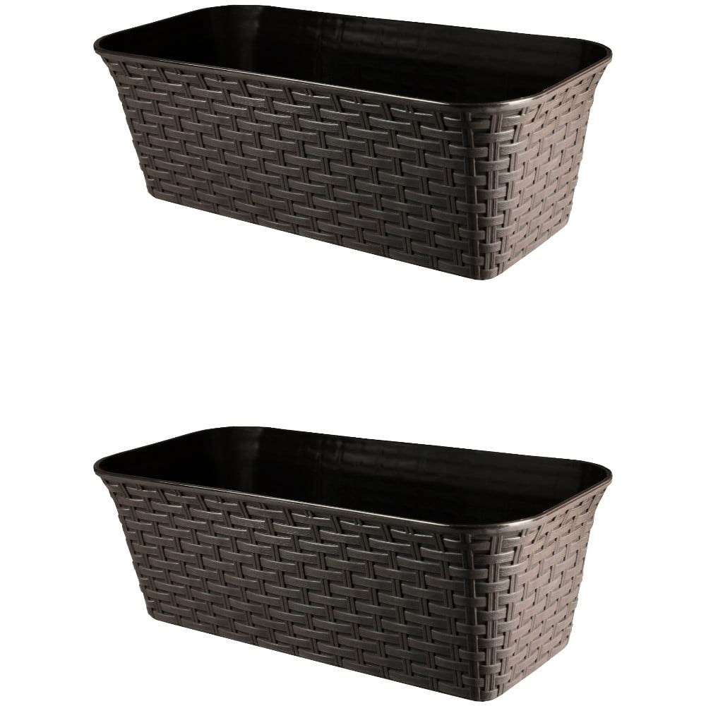 Балконный ящик Violet Ротанг 43 см, с дренажем, венге, 2 шт. N-Kahpo-2-35400-05 - стильное решение для любого интерьера. Ящик для цветов выполнен из экологически чистого и безопасного полипропилена, предназначенного для живых, декоративных или искусственных растений. Кашпо из качественного пластика прекрасно подойдет для оформления подоконника, балкона, лоджии, зимнего сада, а также любых жилых и рабочих помещений, садовых и уличных пространств. Оптимальный размер ящиков позволяет сэкономить пространство и разместить в них сразу несколько растений, создать целую композицию из цветов, а также без труда выращивать рассаду. Горшки для цветов имеют удобную дренажную систему, необходимую для лучшего увлажнения корней. Благодаря ей можно не беспокоиться о проблемах перелива или высыхания растения. Внутренняя сторона кашпо имеет гладкую фактуру, что препятствует прирастанию корней к стенкам горшка и облегчает процесс высадки растений и ухода за ним. Корпус ящика цельный, без отверстий.