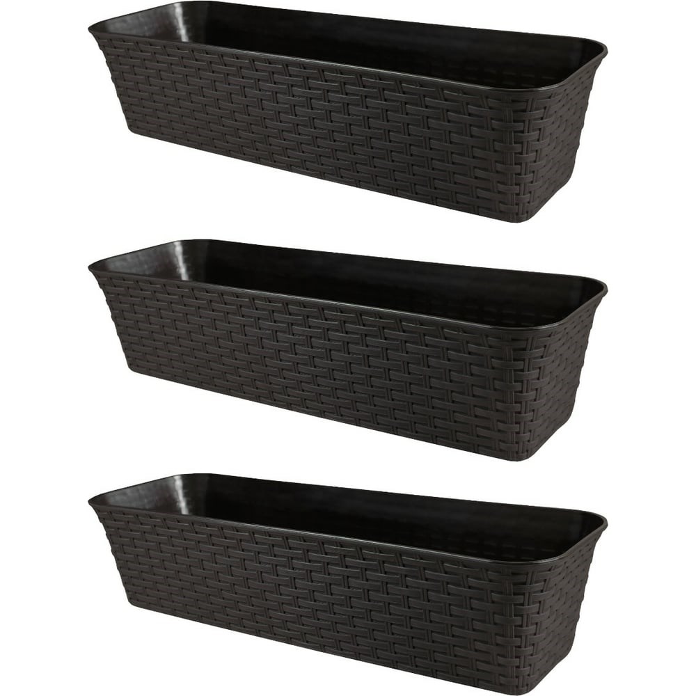 Балконный ящик Violet Ротанг 63 см, с дренажем, венге, 3 шт. N-Kahpo-3-35600-05 - стильное решение для любого интерьера. Ящик для цветов выполнен из экологически чистого и безопасного полипропилена, предназначенного для живых, декоративных или искусственных растений. Кашпо из качественного пластика прекрасно подойдет для оформления подоконника, балкона, лоджии, зимнего сада, а также любых жилых и рабочих помещений, садовых и уличных пространств. Оптимальный размер ящиков позволяет сэкономить пространство и разместить в них сразу несколько растений, создать целую композицию из цветов, а также без труда выращивать рассаду. Горшки для цветов имеют удобную дренажную систему, необходимую для лучшего увлажнения корней. Благодаря ей можно не беспокоиться о проблемах перелива или высыхания растения. Внутренняя сторона кашпо имеет гладкую фактуру, что препятствует прирастанию корней к стенкам горшка и облегчает процесс высадки растений и ухода за ним. Корпус ящика цельный, без отверстий.