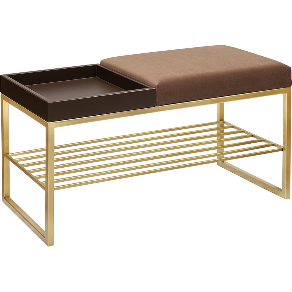 Банкетка предназначена для установки дома или в офисе.Выдерживает большую нагрузку и отличается прочностью.Покрытие устойчиво к износу и прослужит длительное время.Компактный размер модели подходит для любого пространства.Банкетка RUBY BOX с золотым основанием, мягким сиденьем, ящиком для аксессуаров и полкой для обуви. Размеры: 850 х 400 х 450 мм. Стальной каркас изготовлен из профильной трубы 20х20 мм. Открытый ящик выполнен из МДФ, покрыт цветной эмалью, мягкое сиденье - из искусственного велюра. Банкетка с полкой для обуви подойдет для прихожей и входной зоны. Удобно использовать в качестве прикроватной банкетки в спальне. Банкетку-скамью можно разместить в офисе, зале, салоне, фотостудии, гостинице, баре, клубе, кафе и ресторане. Доставляем банкетку в собранном виде в надежной упаковке.
