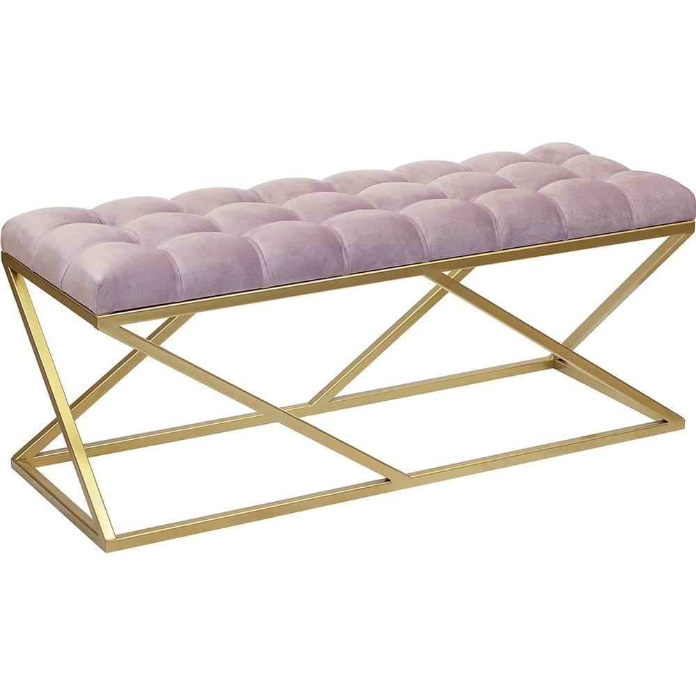 Банкетка ZUMA с золотым основанием и мягкой велюровой подушкой с каретной стяжкой. Характеристики банкетки ZUMA: • размеры: (длина х ширина х высота) 1100 х 400 х 450 мм, • вес – 13,2 кг, • высота подушки — 80 мм, • обивка — искусственный велюр, • наполнитель — пенополиуретан, • максимальная нагрузка — 120 кг. Основание банкетки изготовлено из стали с полимерным покрытием. Стальной каркас изготовлен из профильной трубы 20х20 мм. Собственное производство обеспечивает надежность и эстетику сварных швов металлической мебели. Банкетка с велюровой подушкой отличается элегантным видом и комфортной посадкой. Мягкая обивка с высокой износостойкостью, прошла тест Мартиндейла — 35 000 циклов. Бархатистая ткань легко чистится от загрязнений, для ухода разрешена сухая и влажная чистка. Стильная банкетка подойдет для прихожей, спальни, гостиной и кабинета. Банкетка лофт добавит изысканности интерьеру квартиры, офиса, салона и загородного дома. Банкетка отлично сочетается со стеллажами LOFT. Банкетку доставляем в собранном виде в надежной упаковке.