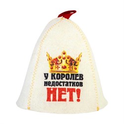 Шапка для бани "У королев недостатков нет" сделана из белого войлока и украшена оригинальным ярким принтом. Шапка является основным банным аксессуаром. Этот предмет защитит голову от перегрева и сделает банные процедуры приятными. Шапки из войлока обладают рядом положительных свойств: они антибактериальны, не электризуются и не впитывают запах, отлично пропускают воздух и тепло, из-за чего всегда поддерживают комфортную температуру и влажность. Шапка универсальна по размеру и оснащена удобным подвесом-петлей, что позволяет с легкостью просушить её после парения.