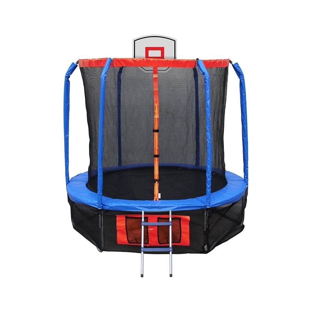 Прочный батут с баскетбольным кольцом, защитной сеткой и лестницей. Батут может использоваться как в помещении, так и на улице каждый день. Надежность конструкции обеспечивается прочной рамой с полимерным двусторонним покрытием, нанесенным методом холодной гальванизации. Прыжковое полотно выполнено из высокого качества Перматрон (Permatron) — эластичный материал, способный возвращаться в исходное состояние при постоянном воздействии с разным усилием. Термическая обработка волокон материала обеспечивает высокую прочность на разрыв, стрессоустойчивость материала. Перматрон влагостойкий, термоустойчивый материал, является антисептиком, не поддается распаду от ультрафиолета. Основа батута - высокопрочная стальная рама со стальными ногами.Защитная сетка из материала "Терилен" снижает трение при касании и не вызывает дискомфортных ощущений. Вход с дополнительной защитой.Нижняя часть каркаса защищена материалом "терилен", для предотвращения травмаопасных ситуаций с попаданием под прыжковое полотно животных и людей. На основном каркасе расположенны дуги безопасности с мягкими вставками, для устойчивости каркаса при интенсивной игре. Так же дуги ограничивают защитную сетку от резкого растяжения.Диаметр батута: 427 см Высота сетки: 170 см (общая высота от пола 250 см)Максимальная нагрузка на батут: 150 кг