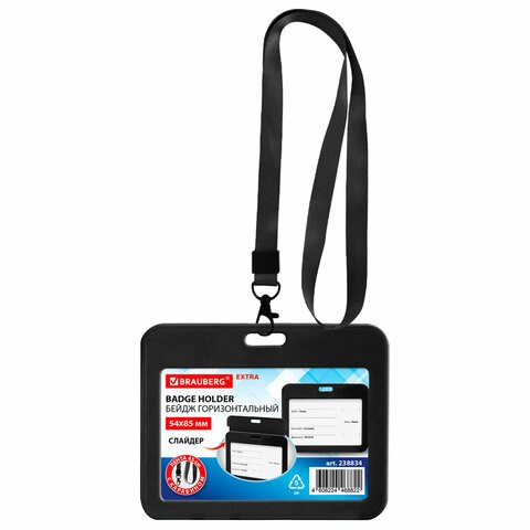 Бейдж горизонтальный (54х85 мм), лента 45 см с карабином, СЛАЙДЕР, черный, BRAUBERG EXTRA, 238834