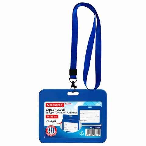Бейдж горизонтальный (54х85 мм), лента 45 см с карабином, СЛАЙДЕР, синий, BRAUBERG EXTRA, 238833