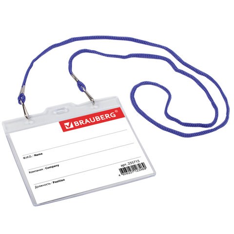 Бейдж горизонтальный БОЛЬШОЙ (90х120 мм), на синем шнурке 45 см, 2 карабина, BRAUBERG, 235715