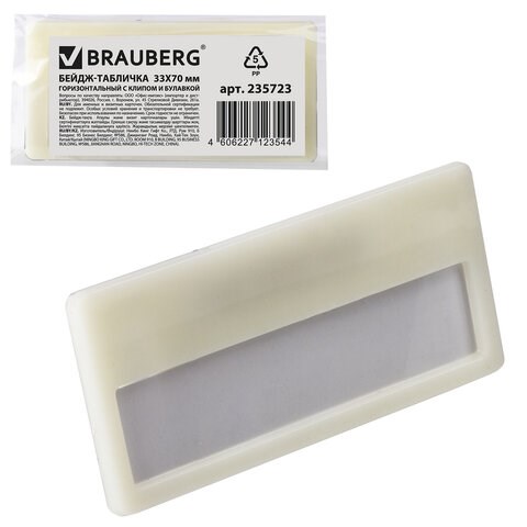 Бейдж-табличка горизонтальный (33х70 мм), с клипом и булавкой, BRAUBERG, 235723
