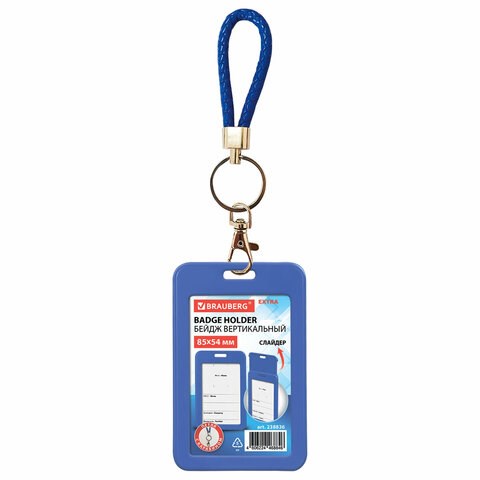 Бейдж вертикальный (85х54 мм), петля с карабином, СЛАЙДЕР, синий, BRAUBERG EXTRA, 238836