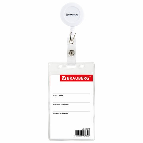 Бейдж вертикальный (90х60 мм), с держателем-рулеткой 70 см, белый, BRAUBERG, 238243