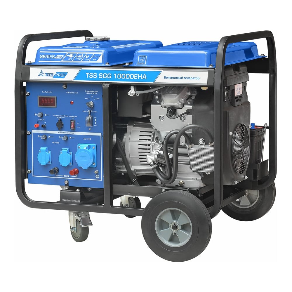 Бензогенератор ТСС SGG 10000 EHA 190009 - компактная и производительная конструкция, которая обладает высокой мощностью. С учетом сравнительно небольшого уровня потребления топлива модель имеет хорошую автономность. Бензогенератор может применяться на даче, в коттедже, в автосервисе, коммунальной и строительной сфере, уличной торговле или в летнем кафе для подключения бытовых приборов или строительного инструмента. Работает на бензине АИ-92. Рекомендуемое к эксплуатации масло SAE 10W30. Особенности конструкции: Интеллектуальный модуль с многофункциональным дисплеем предлагает эффективный способ контроля параметров работы (на дисплее отображаются часы работы бензогенератора, напряжение, частота тока), Электронная система аварийной защиты (контролирует параметры работы станции и, при необходимости, выключит генератор, в том числе по перегрузке или по низкому уровню масла), Автоматический регулятор напряжения обеспечивает высокое качество выходного напряжения, Автоматический выключатель для защиты от перегрузок и короткого замыкания. К преимуществам изделия можно также отнести прочную раму, которая частично гасит вибрации двигателя и наличие колес. За счет этого перемещение и подъем на высоту не требуют много сил или специального такелажного оборудования.