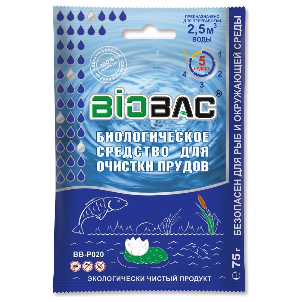 Биологическое средство для очистки прудов БиоБак BB-P020 рассчитано на 2.5 куб.м воды. Подходит для природных и искусственных водоёмов. В его составе микроорганизмы и природные минеральные сорбенты. Средство обладает свойствами, такими как: Осветляет воду; Разлагает ил и донный осадок; Разлагает остатки корма и иные органические отложения; Препятствует развитию водорослей; Снижает уровень аммиака в воде; Устраняет неприятные запахи; Препятствует развитию личинок насекомых; Способствует здоровому росту рыб, укрепляет их иммунную систему; Поддерживает идеальный биологический баланс в водоёмах.