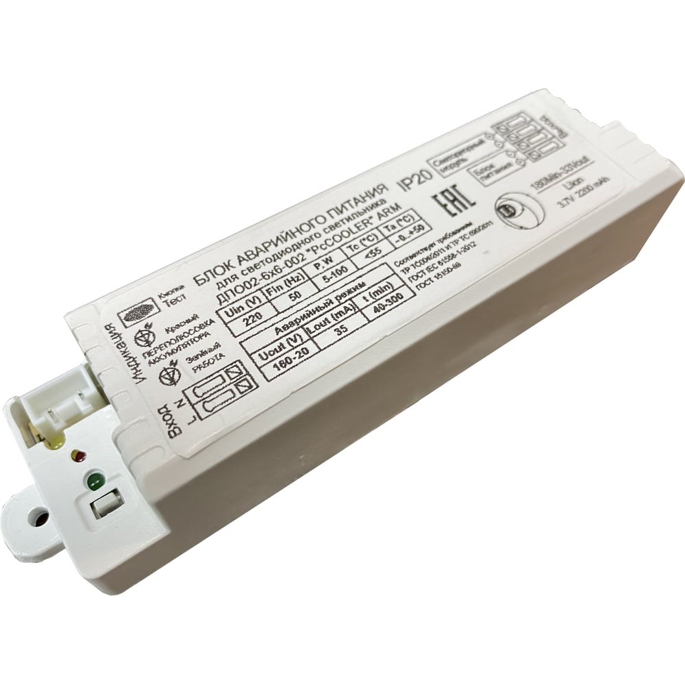 Блок Аварийного Питания (в дальнейшем «БАП») предназначен обеспечения аварийного освещения помещений при эвакуации или тревоги, в случае выключения электроэнергии. БАП состоит из платы управления, преобразователя и аккумулятора. Оснащён индикатором режимами работы и заряда батареи. В обычном режиме работы от сети происходит заряд аккумуляторной батареи. Переход от нормального режима работы в аварийный режим происходит автоматически при исчезновении входного напряжения на блоке питания светильника и на входе в БАП. Продолжительность работы светильника в аварийном режиме 2 часа. При первой установке светильника продолжительность заряда аккумуляторной батареи - 24 часа. Рабочее напряжение-220В±10%, 50 Гц. Iout=20-40 mA (указан на блоке). Uout=20-160 В (указан на блоке). Pout= 5 Вт. Длительность работы в аварийном режиме-(1-3) часа. КПД системы - до 68 %. Длина питающих проводников 220в - 210 мм. Тип батареи: Li-Батарея Номинальная емкость 2200 mAh. Номинальное напряжение- 3,7 В. Температурный диапазон от 0 до +50°C.