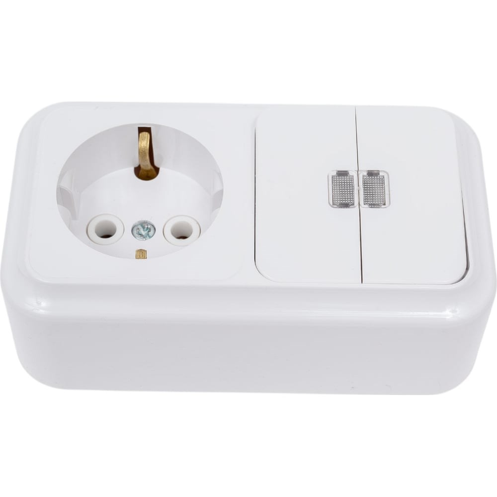 Блок Bylectrica, 2 выключателя + розетка с заземляющим контактом ОУ с подсветкой, серия ПРАЛЕСКА, белый 2В-РЦ-569