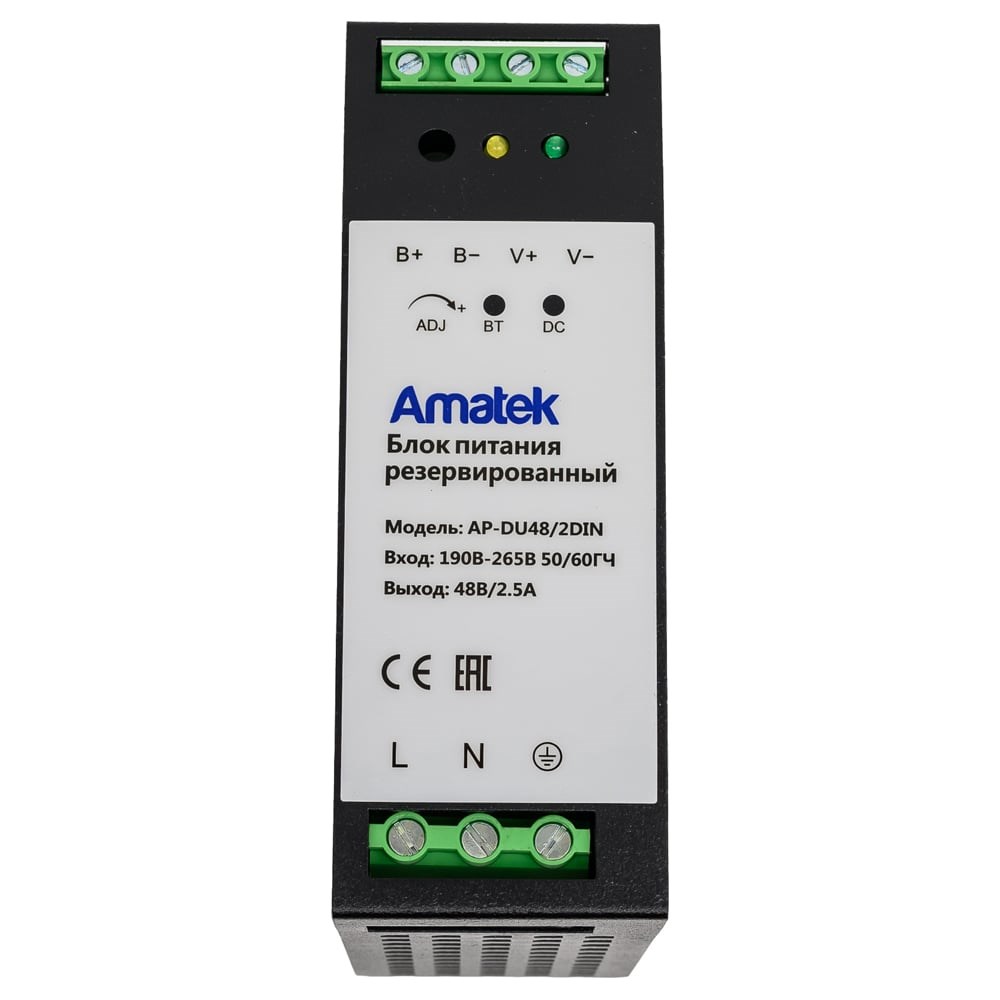 Блок питания Amatek AP-DU48/20DIN 48В / 2,5А резервированный, стабилизированный 7000707 предназначен для обеспечения потребителей бесперебойным электропитанием с номинальным стабилизированным напряжением 48В постоянного тока и током потребления до 2,5А. Стабилизированный блок питания формирует выходное напряжение для питания нагрузки и осуществляет заряд внешней АКБ (при наличии). При отключении напряжения питающей сети блок питания автоматически переходит на резервное питание от внешней АКБ (при наличии). Электропитание от сети переменного тока 50 Гц напряжением от 190 В до 265В. Источник питания устанавливается на DIN-рейку. Блок питания предназначен для установки в помещении и рассчитан на круглосуточный режим работы. Отличительные особенности Amatek AP-DU48/20DIN: Выход: = 48В, ток 2,5А, 135Вт Регулировка выходного напряжения 48-54В Вход: ~190-265В, 50Гц, до 1,0А Возможно подключение внешней АКБ: 7Ач, 12В, 4шт Защита от перегрузки по выходу 3А Защита от повышения напряжения по выходу 60В Автоматическое восстановление выходного напряжения после снятия перенапряжения или перегрузки; Пульсация напряжения на выходе не более 400 мВp-p Эффективность (КПД) 90% Пластмассовый корпус 43×124×113 мм с возможностью монтажа на DIN-рейку; Эксплуатация: от -20°С до +50°С, влажность 10 - 90% RH.