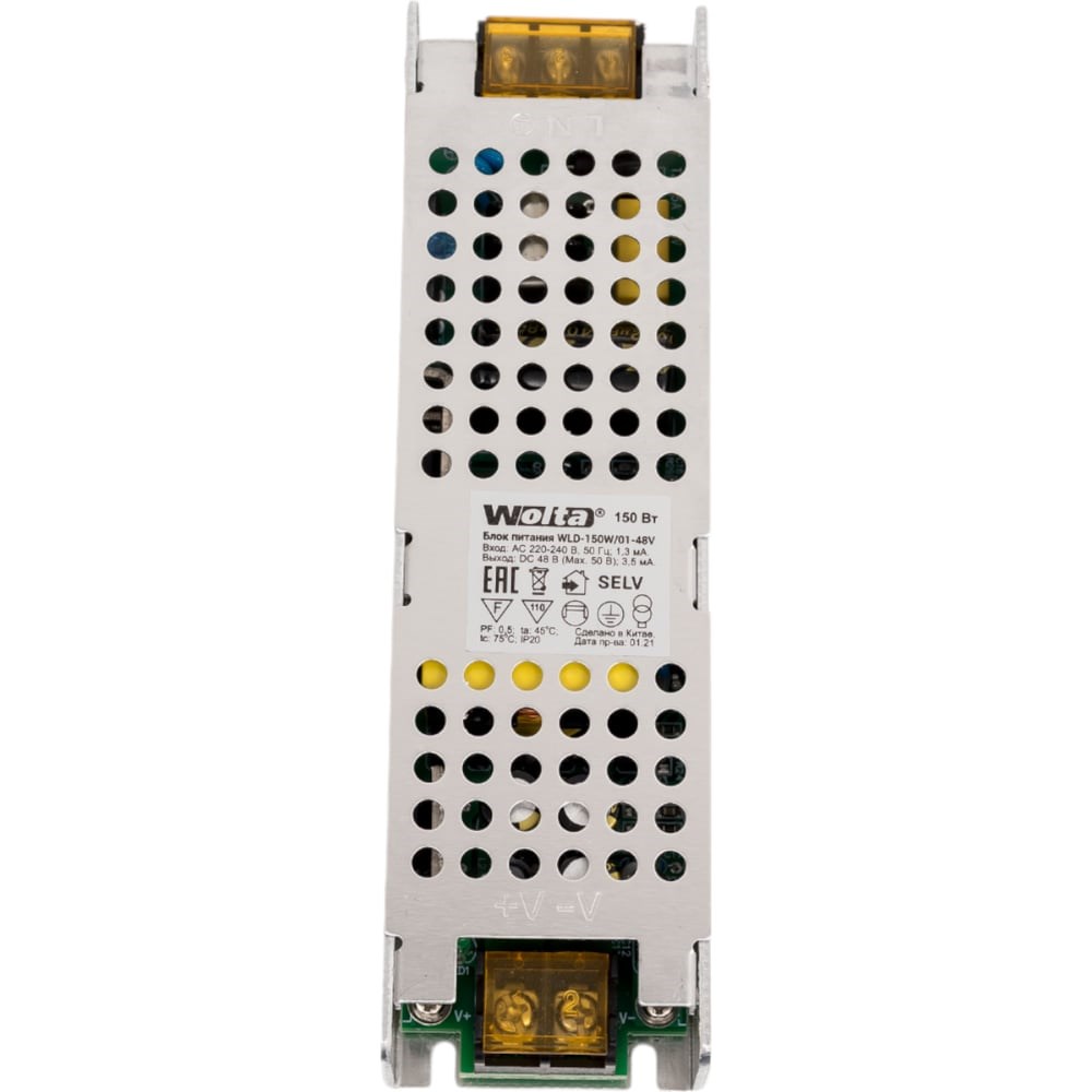 Блок питания Wolta для светодиодной ленты 150Вт 48В IP20 WLD-150W/01-48V используется для преобразования сетевого напряжения 230 В 50 Гц в безопасное сверхнизкое напряжение и питания ламп класса защиты III. Блок питания (источник напряжения) серии WLD-01-48V предназначен для преобразования напряжения сети 230 В 50 Гц в БСНН (безопасное сврхнизкое напряжение) и питания светодиодных светильников класса защиты III и светодиодных лент. Блок питания соответствует всем необходимым требованиям, предъявлемым к данному типу оборудования. Качество электроэнергии должно соответствовать ГОСТ 32144-2013. Питающая сеть должна быть защищена от коммутационных и грозовых импульсных помех. Продукция соответствует требованиям Технических регламентов Таможенного союза: ТР ТС 004/2011, ТР ТС 020/2011