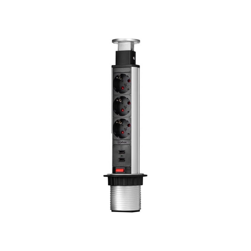 Выдвижной встраиваемый механическийблок розеток Mebax 105S 3 2usbсеребряного цвета на 3 розеткии 2usb — классический встраиваемый блок розеток с механическим приводом. Стильное и функциональное решение для монтажа в любую поверхность: от кухонной столешницы до компьютерного стола. Альтернатива удлинителям и розеткам.Работа без сбоевОбъединение гнездовых контактов и контактную группу розеток в одно целое обеспечивает защиту блока от перегрева платы, потери контакта и короткого замыкания.Удобная крышкаПокрытие крышки обеспечивает надёжную защиту от механических повреждений, появления царапин и отпечатков пальцев. Крышка розетки не выступает над поверхностью, когда она неактивна.Простое управлениеДля активации устройства нажмите на крышку и потяните корпус блока вверх до щелчка стопора. Чтобы убрать устройство, надавите на стопор, опустите корпус розетки вниз и закройте крышку.Лидер продажMebax 105S является абсолютным бестселлером — за всё время было продано почти 10 тыс. экземпляров. Это универсальный блок, который совмещает необходимый базовый функционал и стильный дизайн.ку.
