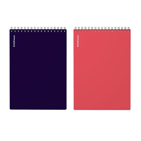 Блокнот формата А5 (148х210 мм). Обложка из высококачественного износостойкого матового пластика с фактурой "софт-тач". В блоке 80 листов в клетку. Бумага офсетная плотностью 60 г/м2. Цвет линовки – синий. Скругленные уголки обложки. Тип скрепления – спираль. Блокноты разного цвета упакованы в термоусадочную пленку по 2 штуки.