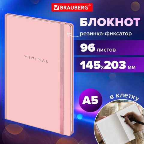 Блокнот с резинкой в клетку 96 л., А5 145х203 мм, твердая обложка, BRAUBERG, "Minimal", розовый, 116319