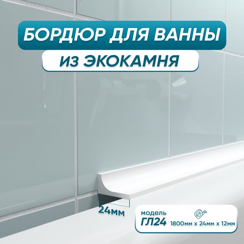 Лаконичное решение для перекрытия зазора между плиткой и ванной. Акриловый камень из которого сделаны бордюры - это твердый, цельный материал. Прост в монтаже и уходе, не меняет свой цвет и форму. Не допускает появления грибка и плесени. Ширины бордюра - 24 мм хватит, для того чтобы перекрыть зазор до 20 мм. Благодаря своим оптимальным размерам, он не только защитит от попадания воды в щели и предотвратит распространение плесени, но и хорошо скроет все мелкие недостатки. Для распила потребуется ножовка по металлу или торцовочная пила с диском по дереву или алюминию, монтаж производится на герметик или водостойкий клей. Для облицовки ванной бордюрами с 3-х сторон вам понадобится: Прямой бордюр 180 см Левый бордюр 75 см Правый бордюр 75 см Если левая и правая сторона ванны более 75 см, то рекомендуем взять прямой бордюр 90 см.