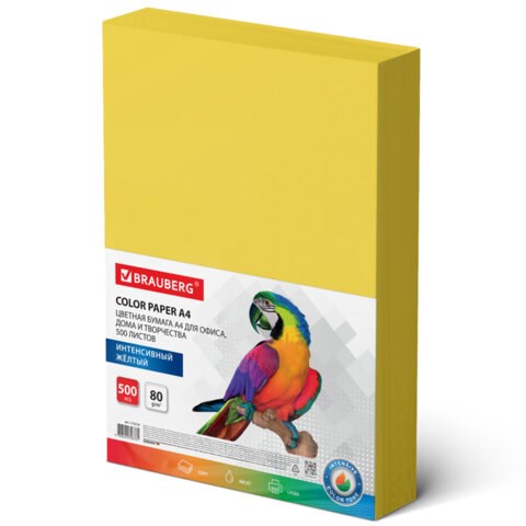 Упакована в пачку из 500 листов формата А4. В упаковке бумага интенсивного тона желтого цвета. Листы бумаги плотностью 80 г/м2 подходят для офисной техники.