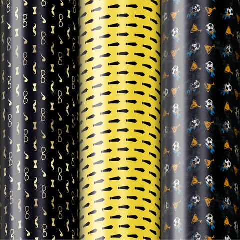 В нашем наборе вы найдёте 3 рулона мелованной бумаги размером 70х100 см, каждый из которых выполнен в универсальном дизайне, разработанном для мужской аудитории. Итоговая плотность бумаги - 80 г/м2. Все три рулона свернуты в один и надежно упакованы в специальный картонный тубус, чтобы избежать повреждения или замятия бумаги в процессе транспортировки.