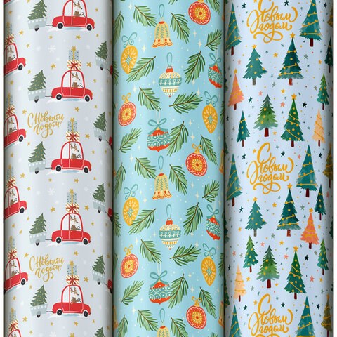 Набор из 3 рулонов, каждый рулон – размером 70х100 см. Все рулоны выполнены в красивом новогоднем дизайне с ярким эффектом. Представляют собой легкомелованную бумагу с нанесенной на нее металлизированной пленкой, за счет которой и достигается красивый переливающийся эффект. Итоговая плотность бумаги – 80 г/м2.