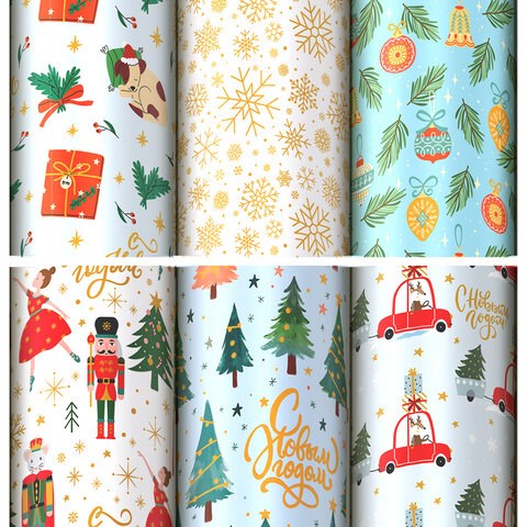 В данном коде представлены 6 дизайнов бумаги с переливающимся эффектом. Каждый рулон имеет размер 70х100 см. Представляет собой легкомелованную бумагу с нанесенной на нее металлизированной плёнкой с новогодним дизайном, за счёт которой и достигается красивый переливающийся эффект. Итоговая плотность бумаги – 80 г/м2. Каждый лист бумаги намотан на картонную втулку для лучшей сохранности бумаги в процессе транспортировки. Каждый рулон также упакован в термоусадочную пленку.