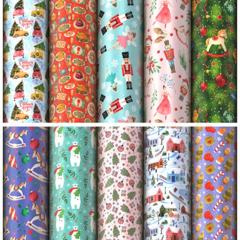 Изготовлена из мелованной бумаги и представлена в 10 универсальных новогодних дизайнах. Бумага плотностью 105 г/м2 упакована в рулоны длиной 100 см и шириной 70 см (± 5%). Поставляется в нескольких вариантах дизайна (без возможности выбора).