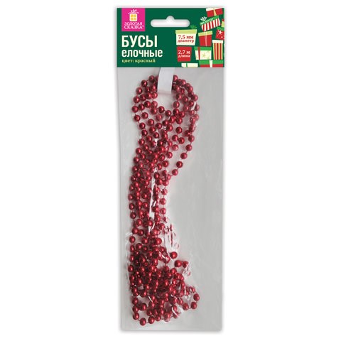 Бусы ёлочные диаметр 7,5 мм, длина 2,7 м, пластик, красные, ЗОЛОТАЯ СКАЗКА, 591137