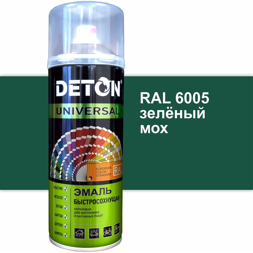 Эмаль DETON акриловая, быстросохнущая, зеленый мох, RAL 6005, аэрозоль 520 мл DTN-A07251 предназначена для покраски предварительно загрунтованных изделий из металла, дерева, камня, бетона, картона и пластика. Благодаря составу, продукт обладает отличной адгезией и высокой укрывистостью. Применяется для внутренних и наружных работ. Образует долговечное покрытие стойкое к атмосферным воздействиям и механическим повреждениям. Насыщенный цвет обеспечивает отличный результат ремонтных, декоративных и дизайнерских работ. Оптимальное давление газа-вытеснителя и поворотное сопло распылительной головки позволяет производить покраску также как профессиональным краскопультом, гарантирует равномерное нанесение и исключает подтеки. Внимание! Фото может отличаться от товара, при выборе ориентируйтесь на технические характеристики.