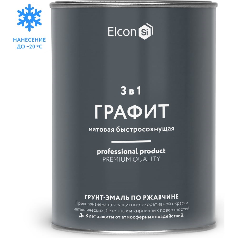 Быстросохнущая грунт-эмаль по ржавчине, металлу 3 в 1 Elcon графит, 0.8 кг 00-00463005Грунт-эмаль 3 в 1 по ржавчине Elcon — это быстросохнущая краска по металлу, совмещающая функции преобразователя ржавчины, грунта и эмали. Грунт-эмаль по ржавчине Elcon 3 в 1 как на чистые, так и на пораженные коррозией поверхности после удаления рыхлого слоя ржавчины. Состав применяется как краска для металла для наружных работ и внутренних работ. Грунт-эмаль создает долговечное коррозионностойкое покрытие со сроком службы до 8 лет.Свойства:• 3 в 1: Совмещает свойства преобразователя ржавчины, грунта и финишного покрытия.• Нанесение на ржавчину: Предназначена для использования в качестве краски по ржавчине и краски по металлу.• Быстрая сушка: Время высыхания «на отлип» — 1 час при +20°C.• Низкотемпературное нанесение: Грунт-эмаль Elcon 3 в 1 можно наносить при температурах до -20°C.•Атмосферостойкость: Формирует покрытие, устойчивое к атмосферным воздействиям.• Цвет: Грунт-эмаль по ржавчине соответствует оттенкам RALK5Области применения:Грунт-эмаль по металлуElcon 3 в 1 применяется для антикоррозионной защиты любых металлических поверхностей Строительные металлоконструкции: балки, каркасы, элементы кровли Уличные объекты: ограждения, ворота, двери, уличная мебель Легковесные металлоизделия: декоративные элементы, щиты, корпуса