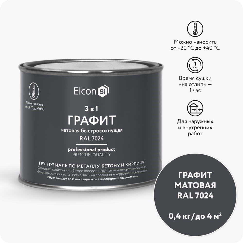 Быстросохнущая грунт-эмаль по ржавчине, металлу 3 в 1 Elcon графит, 0.4 кг 00-00463006Грунт-эмаль 3 в 1 по ржавчине Elcon — это быстросохнущая краска по металлу, совмещающая функции преобразователя ржавчины, грунта и эмали. Грунт-эмаль по ржавчине Elcon 3 в 1 как на чистые, так и на пораженные коррозией поверхности после удаления рыхлого слоя ржавчины. Состав применяется как краска для металла для наружных работ и внутренних работ. Грунт-эмаль создает долговечное коррозионностойкое покрытие со сроком службы до 8 лет.Свойства:• 3 в 1: Совмещает свойства преобразователя ржавчины, грунта и финишного покрытия.• Нанесение на ржавчину: Предназначена для использования в качестве краски по ржавчине и краски по металлу.• Быстрая сушка: Время высыхания «на отлип» — 1 час при +20°C.• Низкотемпературное нанесение: Грунт-эмаль Elcon 3 в 1 можно наносить при температурах до -20°C.•Атмосферостойкость: Формирует покрытие, устойчивое к атмосферным воздействиям.• Цвет: Грунт-эмаль по ржавчине соответствует оттенкам RALK5Области применения:Грунт-эмаль по металлуElcon 3 в 1 применяется для антикоррозионной защиты любых металлических поверхностей Строительные металлоконструкции: балки, каркасы, элементы кровли Уличные объекты: ограждения, ворота, двери, уличная мебель Легковесные металлоизделия: декоративные элементы, щиты, корпуса