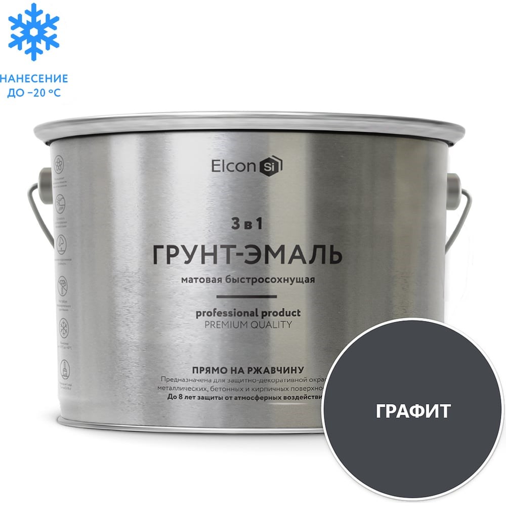 Грунт-эмаль Elcon 3 в1 графит RAL 7024, матовая, графит 2 кг 00-00463008 предназначена для нанесения как на чистые, так и на пораженные коррозией металлические поверхности с целью создания надежной антикоррозионной защиты металлоконструкций, оборудования, металлических изделий. Грунт-эмаль 3 в 1 Elcon сочетает в себе функциональные свойства преобразователя ржавчины, антикоррозионного грунта и декоративной эмали.Указания к применению:Очистить поверхность от загрязнений, обезжирить растворителем Elcon R или ксилолом (недопустимо использовать уайт-спирит, сольвент, бензин)Перед применением тщательно перемешать, при необходимости разбавить растворителем Elcon R до 10% от общей массыДопускается нанесение без предварительного грунтованияЭмаль наносится на сухую поверхность в 2–3 слоя с промежуточной сушкой 1-2 часа при температуре +20°CВремя окончательной сушки при температуре (20±2) °С — 24 часаСрок окончательной полимеризации покрытия при температуре (20±2) °С — 72 часаОбласти применения:Металлические изделияСадовая мебельВоротаЗаборыДвериТеплицыСветильникиСкамьиОборудование