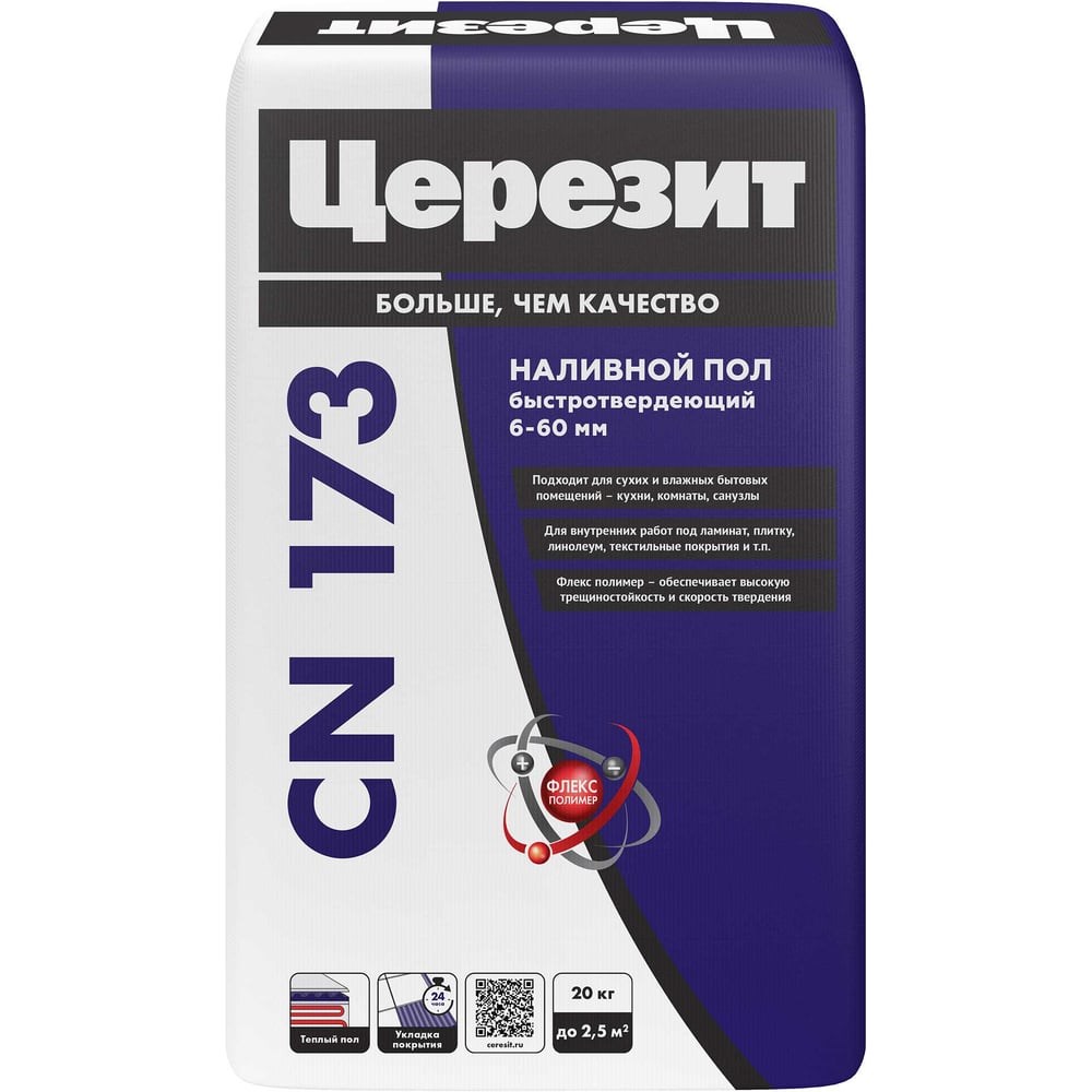 Быстротвердеющая самовыравнивающаяся смесь Церезит CN 173/20 Пол 20 кг 2021029 предназначена под укладку напольных покрытий, а также для изготовления и ремонта стяжек. За один проход смесь можно наносить слоем толщиной от 6 до 60 мм.Продукт используют для выравнивания бетонных, цементно-песчаных, ангидритных и гипсовых оснований пола под укладку керамических плиток, линолеума, ковролина, ламината и других напольных покрытий, а также для изготовления и ремонта стяжек, связанных с основанием.Применяется в сухих помещениях с низкими механическими нагрузками (жилых, бытовых, административных).