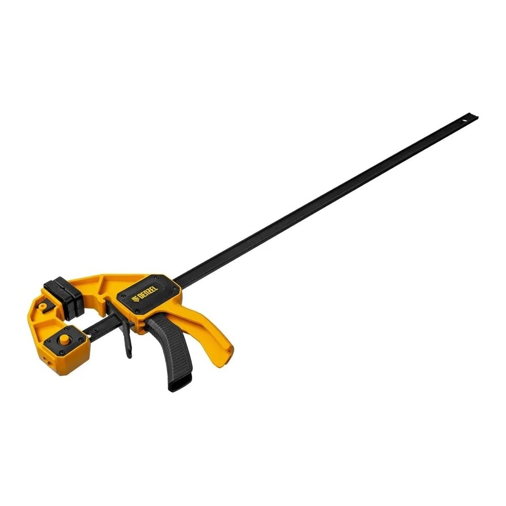 Усиленная конструкция — нейлоновый корпус устойчив к ударным нагрузкам и падениям с небольшой высоты. Увеличенная жесткость и прочность — направляющая выполнена из двутаврового стального профиля и закалена. Универсальное применение — плавающая губка обеспечивает уверенное сцепление с любой поверхностью. Аккуратная работа с любыми материалами — съемные мягкие губки позволяют зафиксировать деталь без риска повреждения и деформации. Расширенный функционал — переставные губки позволяют использовать струбцину на разжим. Комфортное использование — струбцина весит всего 760 г, обрезиненная кнопка фиксации обеспечивает удобный захват.