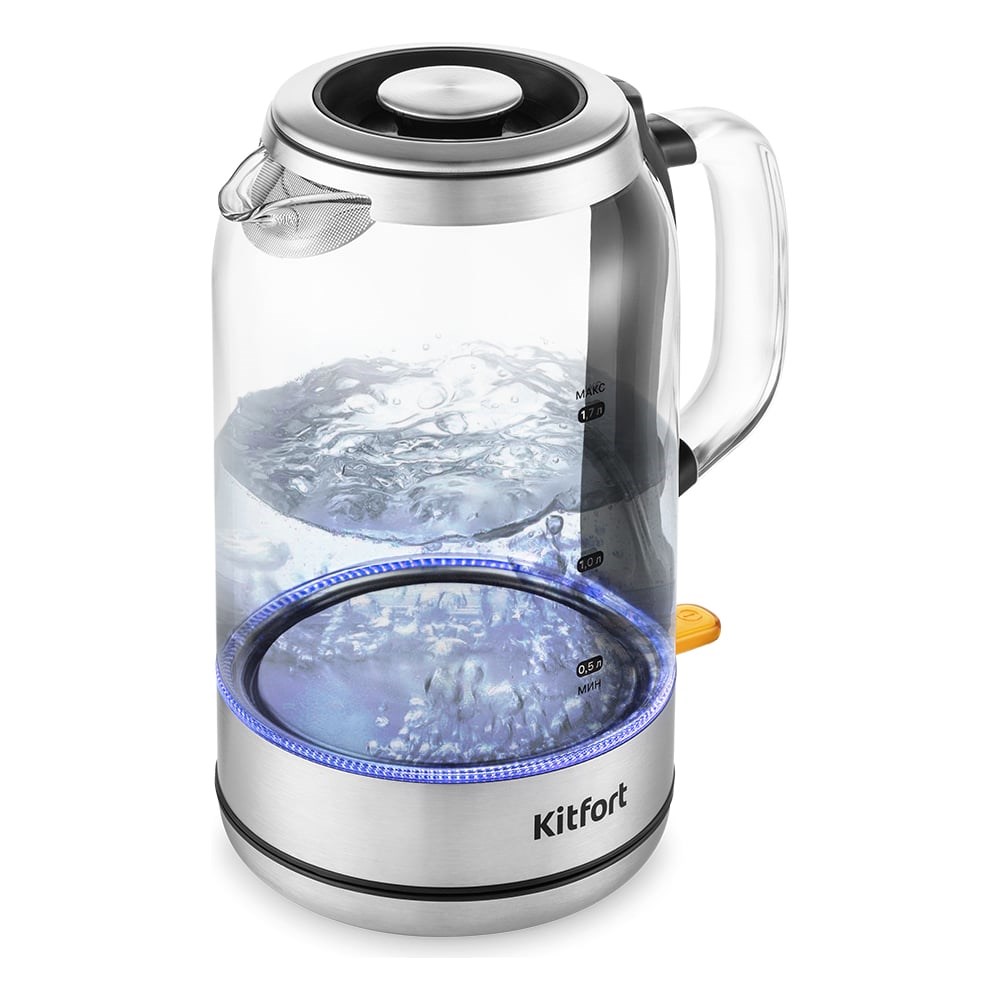Электрический чайник Kitfort КТ-6193 предназначен для кипячения воды дома, в офисе, на даче. За один раз в чайнике можно вскипятить 1,7 л воды. Легкая очистка. Чайник КТ-6193 имеет съемную крышку и большое горлышко, что облегчает доступ внутрь чайника при его чистке и во время удаления накипи. В носике чайника расположен фильтр от накипи. Просто и удобно. Кнопка включения находится под ручкой. При включении чайника загорается подсветка, которая является индикатором работы. Конструкция чайника не позволяет ручке нагреваться, поэтому браться за нее абсолютно безопасно. Без лишних проводов. Подставка с центральным контактом дает возможность располагать на ней чайник в любом положении, обеспечивая вращение на 360°. Снизу имеется отсек для хранения шнура, в который можно смотать излишки шнура электропитания, чтобы он не мешал на столе. Тихая работа. Нагревательный элемент (ТЭН) у этой модели чайника скрытый и находится в донной части. Сверху он закрыт металлической пластиной из нержавеющей стали. Такая конструкция облегчает уход и значительно снижает шум при нагревании воды.