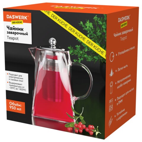 Чайник заварочный 950 мл, жаропрочное стекло, металлическая колба-заварник, DASWERK (ДАСВЕРК), 608647