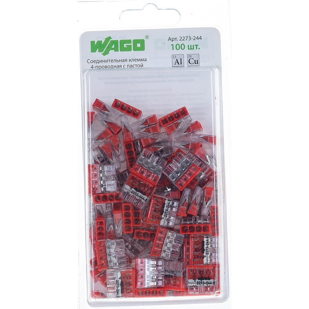 Соединительная клемма для быстрого монтажа WAGO 2273-244 4-х проводная, 0,5-2,5 кв.мм, 450В, 24А, с пастой, 100 шт 2687 предназначена для соединения медных или алюминиевых одножильных проводников. Компактные размеры клемм позволяют использовать их в условиях ограниченного пространства. Прозрачный корпус позволяет визуально контролировать правильность положения проводника и длину снятия изоляции. Проводящая часть соединителя изготовлена из меди.