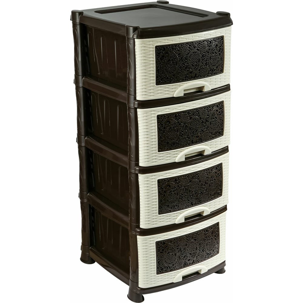 Четырехсекционный комод Violet Ажур коричневый 35421 предназначен для хранения вещей, различных мелочей, принадлежностей, игрушек, косметики, аксессуаров или продуктов питания. Оригинальный дизайн и ажурная вставка на передних стенках ящика позволит комоду гармонично вписаться в интерьер любой комнаты. Легкий и вместительный, он поможет обеспечить порядок в квартире, доме или на даче. Комод этажерка прост в уходе и легко моется. Он подойдет для кухни, гостиной, спальни, детской, прихожей, гардероба или ванной. Можно использовать комод Violet как шкаф для вещей, органайзер для хранения с ящиками для канцелярских предметов или детских игрушек. Пластиковый комод имеет вместительные ящики контейнеры для хранения, благодаря которым можно сэкономить пространство. Комод легко собирается, доставляется в разобранном виде в индивидуальной коробке. Благодаря небольшому весу комод мобильный - его легко переставить в другое место.