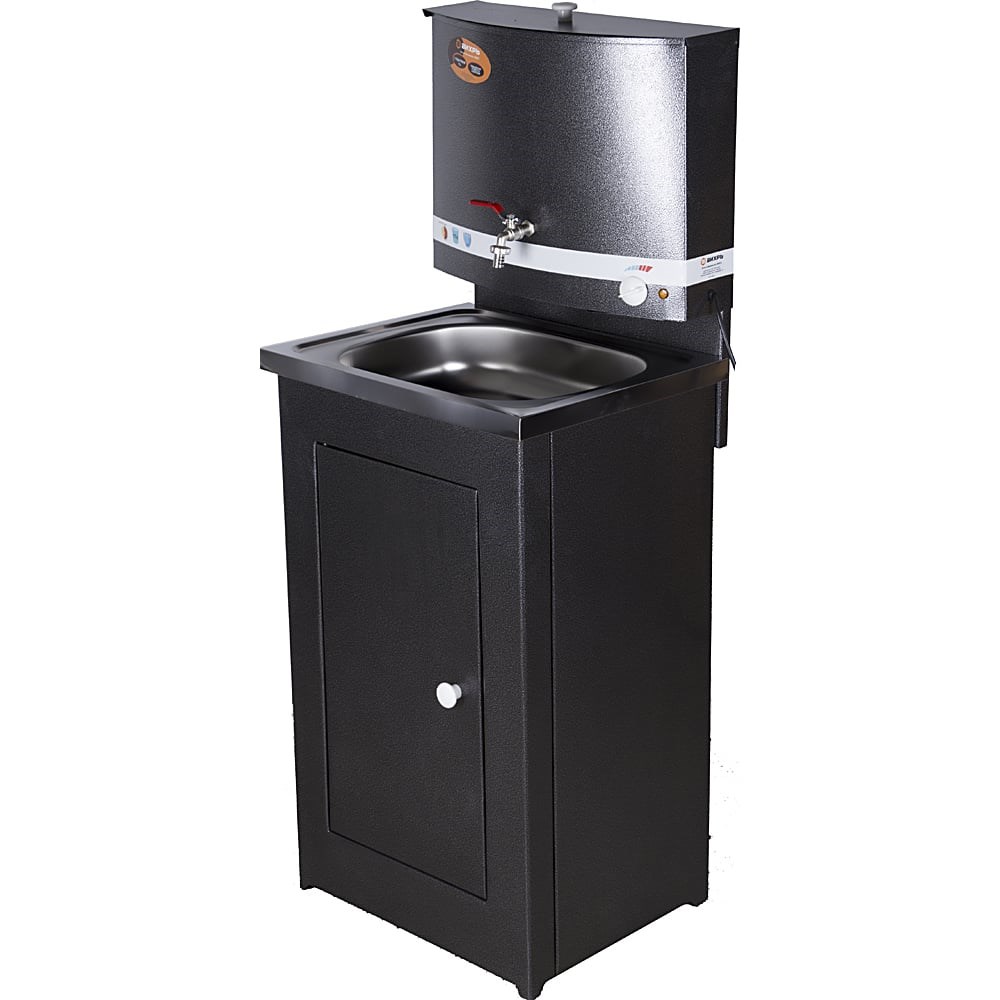 Дачный умывальник Вихрь «Люкс» можно устанавливать в неотапливаемых помещениях, банях, теплицах и на крытых верандах. Он выполнен из окрашенного металла толщиной 0,7 мм, включая каркас тумбы. Благодаря этому умывальник не ржавеет и не деформируется от жары, мороза, ультрафиолета.Вода заливается в бак объемом 17 л через верхнюю крышку на петлях. Термостат позволяет выставлять и автоматически поддерживать нужную температуру воды. Нагревательный элемент мощностью 1300 Вт снабжен защитой от перегрева. Конструктивно ТЭН опущен ниже уровня крана – в баке останется вода, даже если вы забудете закрыть вентиль. Кран шаровый, металлический, ½ дюйма, имеет резьбу для крепления шланга. Раковина накладная, сделана из нержавеющей стали. Слив идет в емкость под раковиной, а также возможно подключение к канализации (сифон в комплект не входит). Дверца плотно прилегает к каркасу, ее размер увеличен для комфортного обслуживания сливной емкости.Комплект из бака, тумбы и раковины поставляется в разобранном виде. Он упакован в картонную коробку размером 0,5*0,42*1,2 м и весом 12 кг. Инструкция для сборки и все необходимые крепежи идут в комплекте.