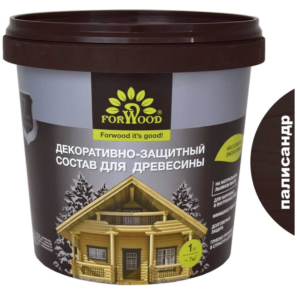 Декоративно-защитный состав для древесины Forwood ВДПФ-1601 палисандр, 1 л 4630058024466 предназначен для отделки ранее не окрашенных деревянных поверхностей (дома, заборы и т.п.). Образует долговечное финишное декоративное покрытие, подчеркивает природную фактуру древесины. Срок службы на фасаде более 7 лет. Внимание! Не рекомендуется для твердых пород древесины (например лиственница, дуб и т.д.).