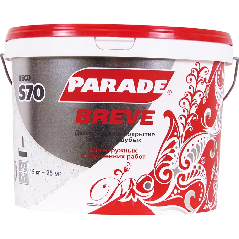 Декоративное покрытие PARADE DECO Breve S70 с эффектом мелкой шубы, белый, 15 кг 90001905113 образует высококачественное матовое покрытие с рельефной поверхностью под "шубу" (максимальный размер зерна 0.5 мм). Продукт обладает отличными адгезионными свойствами к материалам: бетон, цемент, фиброцемент, шпатлевки, минеральные штукатурки, щелочные поверхности, кирпич, камень, гипс, металл (использовать с антикоррозионным грунтом), ДСП, ДВП. Атмосферостойкие свойства позволяют использовать материал для внутренних и наружных работ. Благодаря высокой паропроницаемости покрытие "дышит". При использовании валика с коротким ворсом расход 0.6 кг/кв. м. Компьютерная колеровка PARADE (машинным) способом или вручную колерами PARADE для водных красок позволяют получить желаемый оттенок. Сертифицирована для применения в детских и лечебных учреждениях.